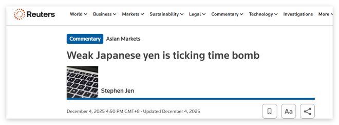 另外,西村还在另一则帖文中转发了英国路透社一篇对高市政府经济政策表示担忧的报道。在这篇报道中,路透社使用了一个名为“高市崩坏”的标签,描述了自高市成为日本首相以来,日元持续走低的情况。该报道认为,日元的一路走低和日本国债近期相当不利的变化,都说明市场对日本政府的高负债水平和金融健康状况的担忧,正不断加剧。