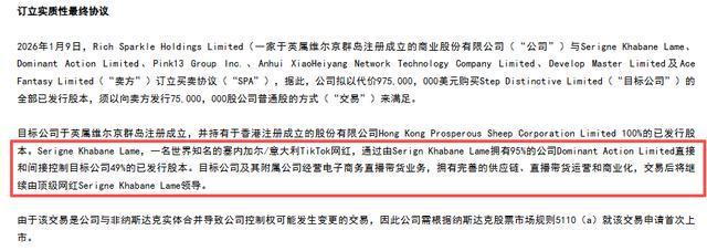 2026年1月,美股上市公司Rich Sparkle宣布完成对Step Distinctive的收购。该目标公司经营电子商务直播带货业务,由无语哥直接或间接持股49%,安徽小黑羊网络科技有限公司持股13%。天眼查信息显示,安徽小黑羊的控股股东为合肥领头羊文化传媒有限公司,该公司最终受益人系张庆杨、张开杨。