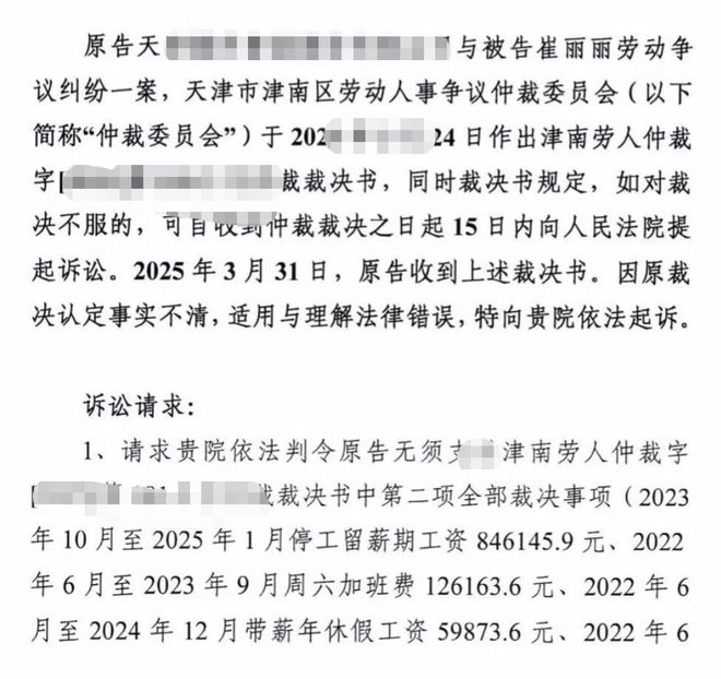 崔丽丽提供的该案起诉状(企业为原告,崔丽丽为被告)显示,原告天津某股份公司,起诉请求法院判令企业无需承担崔丽丽在劳动仲裁案中的相关费用。