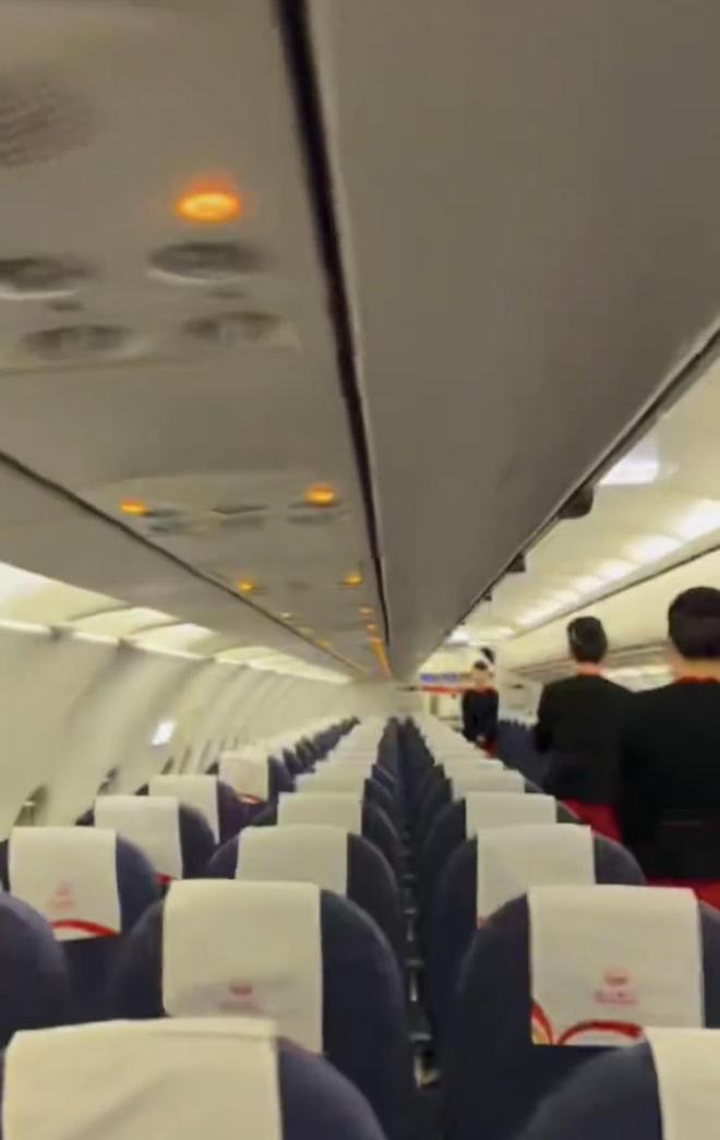 极目新闻记者从其发布的视频中看到,在一架有川航标识的飞机客舱中,该乘客没有出镜,而是用镜头环顾了整个客舱,座位上空无一人,有身着川航服装的三名空姐,分别站在走道中间的不同区域,正按流程在做乘机提醒。