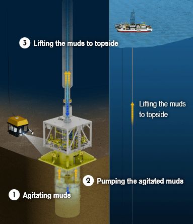 海底采集步骤图:1)搅拌泥浆,2)泵送搅拌后的泥浆,3)将泥浆提升到海上平台,然后该系统会移动到其他地点回收更多的稀土泥浆。 东洋工程公司网站