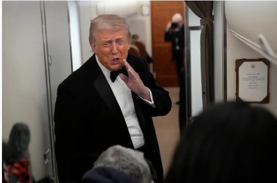 出席 “苜蓿草俱乐部”晚宴后,特朗普在总统专机“空军一号”上和记者交谈(图源:环球网援引外媒)