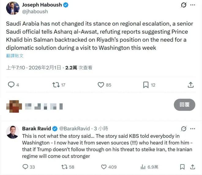 值得一提的是,在《中东报》刊文反驳美媒报道后,沙特媒体阿拉伯卫星电视台(Al Arabiya)驻华盛顿记者约瑟夫·哈布斯(Joseph Haboush)转发了有关内容。但很快,Axios报道的作者之一巴拉克·拉维德(Barak Ravid)在帖文下留言,强调他从7个消息来源处确认哈立德发表过有关言论。